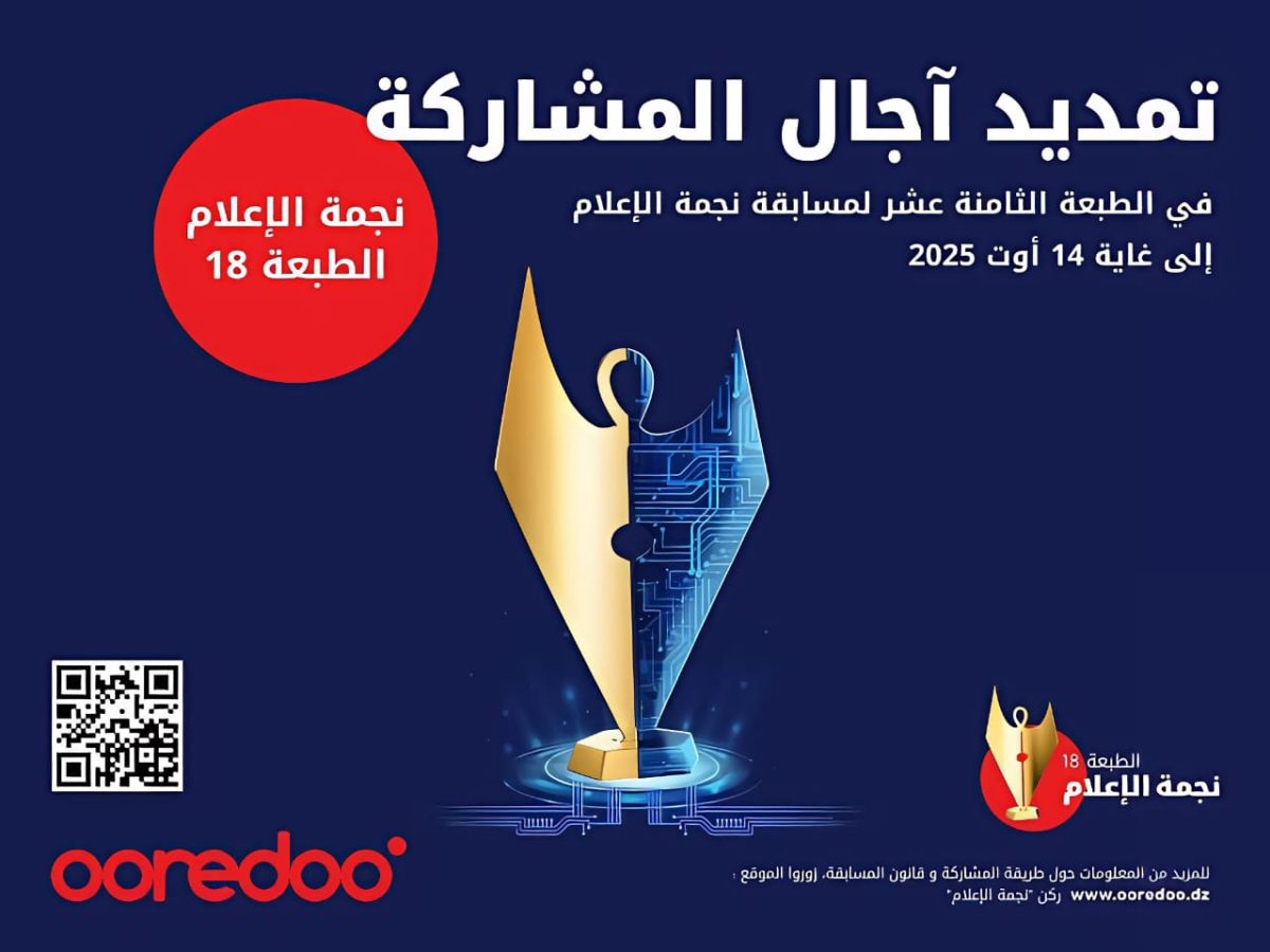 أعلنت شركة أوريدو عن تمديد استثنائي للموعد النهائي لاستقبال الترشيحات الخاصة بالطبعة الثامنة عشرة من مسابقة نجمة الإعلام، وكذا الطبعة الثانية من مسابقة النجمة الصاعدة، الموجهة لطلبة الإعلام والاتصال، استجابة لطلبات عدد كبير من الصحفيين والطلبة الذين تعذر عليهم إيداع أعمالهم في الآجال الأولية.