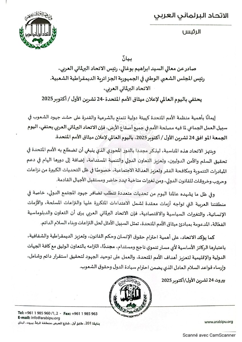 أصدر إبراهيم بوغالي، رئيس المجلس الشعبي الوطني ورئيس الاتحاد البرلماني العربي، بيانًا بمناسبة اليوم العالمي لإعلان ميثاق الأمم المتحدة الموافق لـ24 أكتوبر، أكد فيه إيمان الاتحاد العميق بأهمية منظمة الأمم المتحدة كهيئة دولية تتمتع بالشرعية والقدرة على حشد جهود الشعوب نحو تحقيق المصلحة المشتركة للأمم في جميع أنحاء العالم.