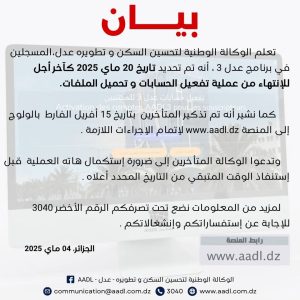 أعلنت الوكالة الوطنية لتحسين السكن وتطويره “عدل”، في بيان لها، اليوم، أن يوم 20 ماي 2025 سيكون آخر أجل أمام المكتتبين ضمن برنامج “عدل 3” لاستكمال عملية تفعيل الحسابات وتحميل الملفات عبر المنصة الرقمية الخاصة بالوكالة.