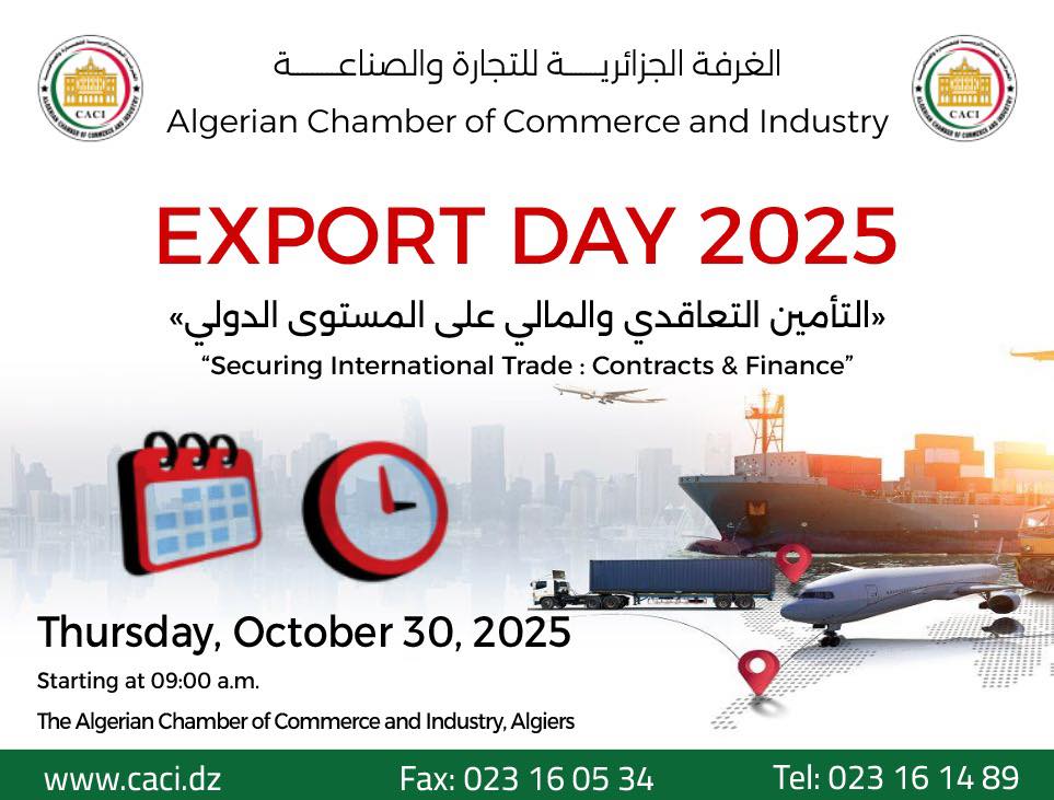 تُعلن الغرفة الجزائرية للتجارة والصناعة عن تنظيم دورة تكوينية بعنوان “Export Day”، يوم 30 أكتوبر 2025، على الساعة التاسعة صباحًا (09:00) بمقرها.