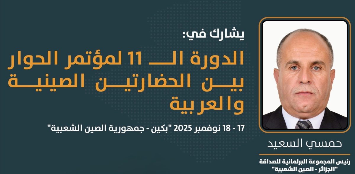 يشارك حمسي السعيد، رئيس المجموعة البرلمانية للصداقة الجزائرية-الصينية، في أشغال الدورة الحادية عشرة لمؤتمر “الحوار بين الحضارتين الصينية والعربية”، المنعقدة يومي 17 و18 نوفمبر 2025 بمدينة بكين في جمهورية الصين الشعبية، ضمن جهود تعزيز التواصل الحضاري وتوسيع التعاون العربي-الصيني، حسب ما أورده بيان المجلس الشعبي الوطني