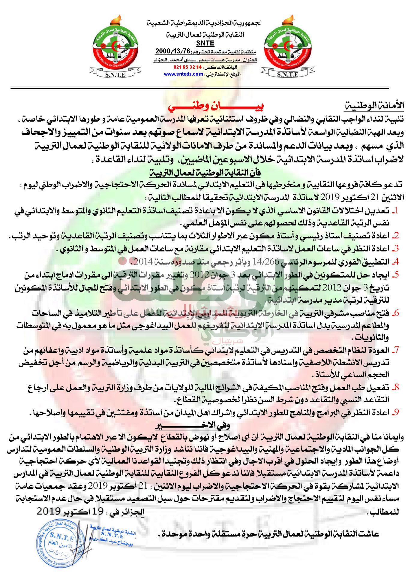 ويضيف البيان دعوة النقابة كافة فروعها ومنخرطيها في التعليم الابتدائي لمساندة الحركة الاحتجاجية والإضراب الوطني لهذا الاثنين 21 أكتوبر الجاري مطالب الأسرة التربوية للطور الابتدائي، أهمها تعديل الاختلالات التي يحتويها القانون الأساي والتي لا تكون إلا بإعادة تصنيف أساتذة التعليم الثانوي المتوسط والابتدائي في نفس الرتبة القاعدية وذلك لحصولهم على نفس المؤهل العلمي، يضيف البيان: