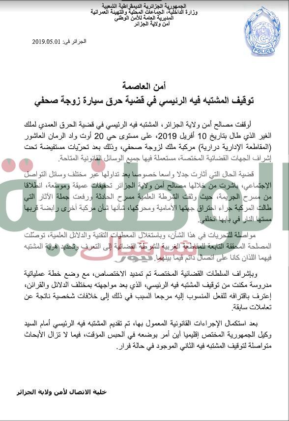 بيان/ ايقاف المشتبه فيه في قضية حرق سيارة زوجة الصحفي عبدو سمار
