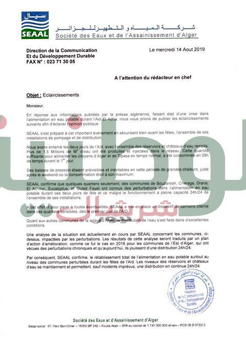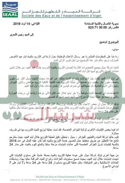 تؤكد شركة سيال -يضيف البيان- أن بعض الأحياء بكل من بلديات بوزريعة، الشراقة، درارية، العاشور، الكاليتوس، وأولاد فايت، عرفت تذبذبات في التزويد بالمياه الشروب خلال يومي العيد وهذا رغم تشغيل جميع منشآتنا بكل طاقاتها على مدار 24 ساعة.