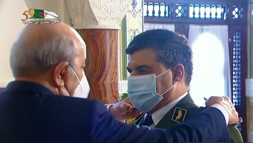 وتم بهذه المناسبة ترقية العميد نور الدين قواسمية، قائد الدرك الوطني، إلى رتبة لواء، وذلك بناءً على أحكام الدستور، وبمقتضى المراسيم الرئاسية المؤرخة يوم 1 جويلية 2021 المتضمنة الترقية في صفوف الجيش العامل.