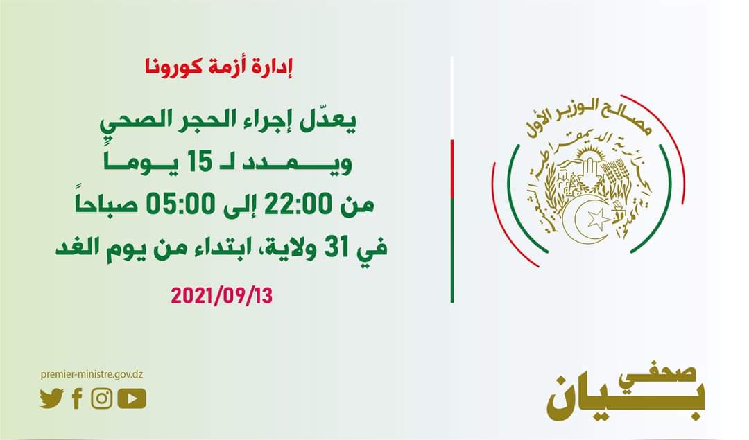 أعلن اليوم الاثنين مصالح الوزير الأول عن تعديل إجراء الحجر الصحي وتمديده لـ 15 يوماً من 22:00 إلى 05:00 صباحاً، في 31 ولاية، ابتداء من يوم غدٍ الثلاثاء.