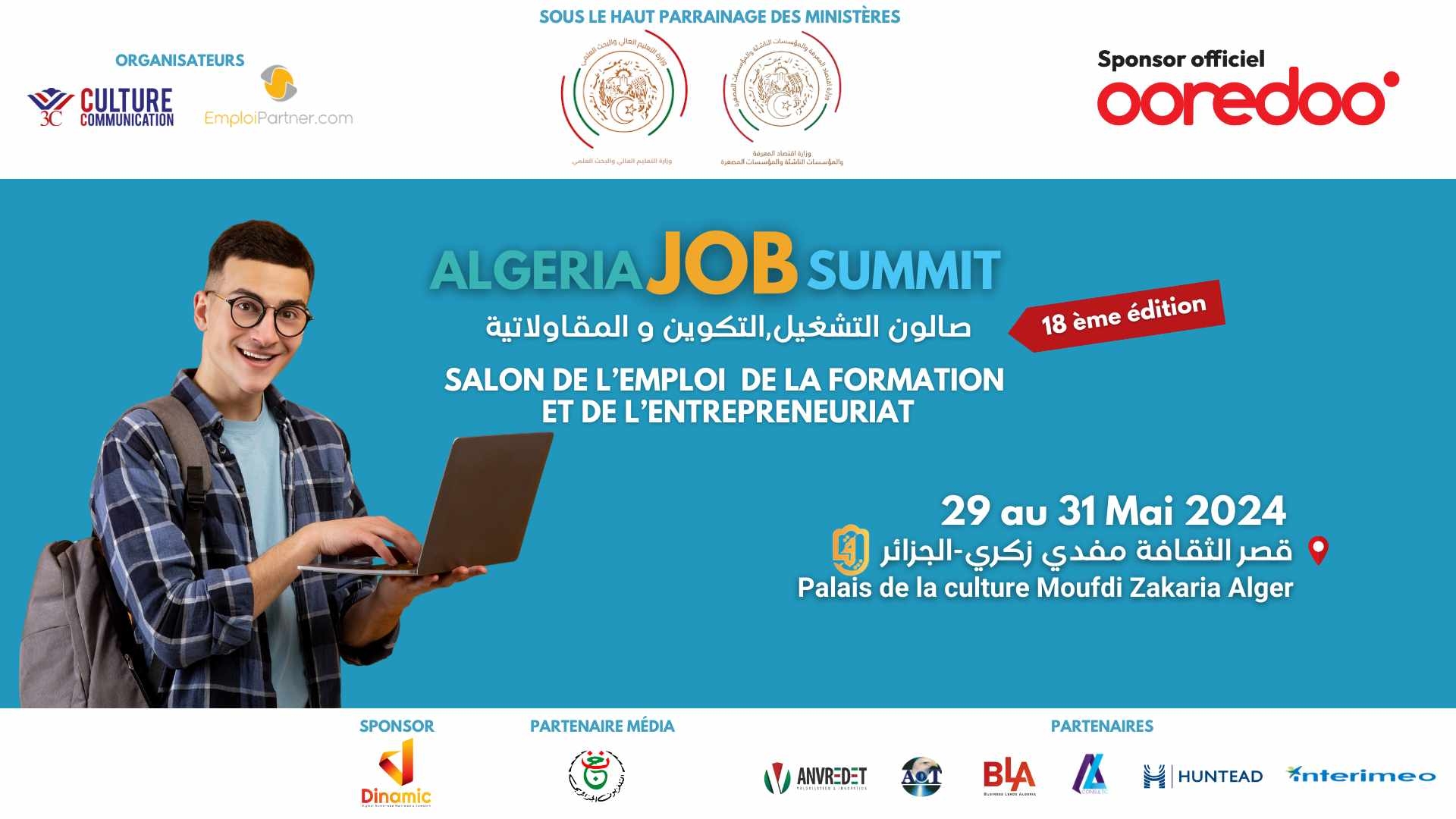 تُنظّم وكالة الإتصال 3C، ووكالة التشغيل Emploi Partner، تحت رعاية وزيري التعليم العالي والبحث العلمي، و المؤسسات المصغرة والشركات الناشئة واقتصاد المعرفة، وبالتعاون مع الوكالة الوطنية لتثمين نتائج البحث و التنمية التكنولوجية ANVREDET، ومتعامل اتصالات الهاتف النقال “أوريدو” الراعي الرسمي للطبعة، من 29 إلى 31 ماي الجاري، بقصر الثقافة مفدي زكرياء، بالجزائر العاصمة، الطبعة 18 للصالون الوطني للتشغيل والتكوين والمقاولاتية ” Algeria Job Summit“.