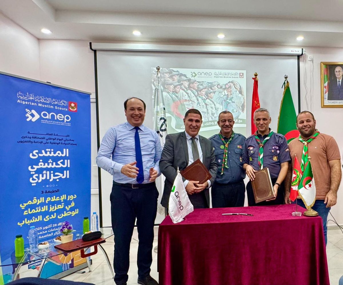 وقّعت المؤسسة الوطنية للاتصال، النشر والإشهار، اليوم الثلاثاء، اتفاقية شراكة مع القيادة العامة للكشافة الإسلامية الجزائرية، بقاعة محمد برامي بالعاصمة، وذلك على هامش فعاليات الطبعة الثالثة من المنتدى الكشفي الجزائري، تزامنًا مع الاحتفال بذكرى استرجاع السيادة على الإذاعة والتلفزيون.