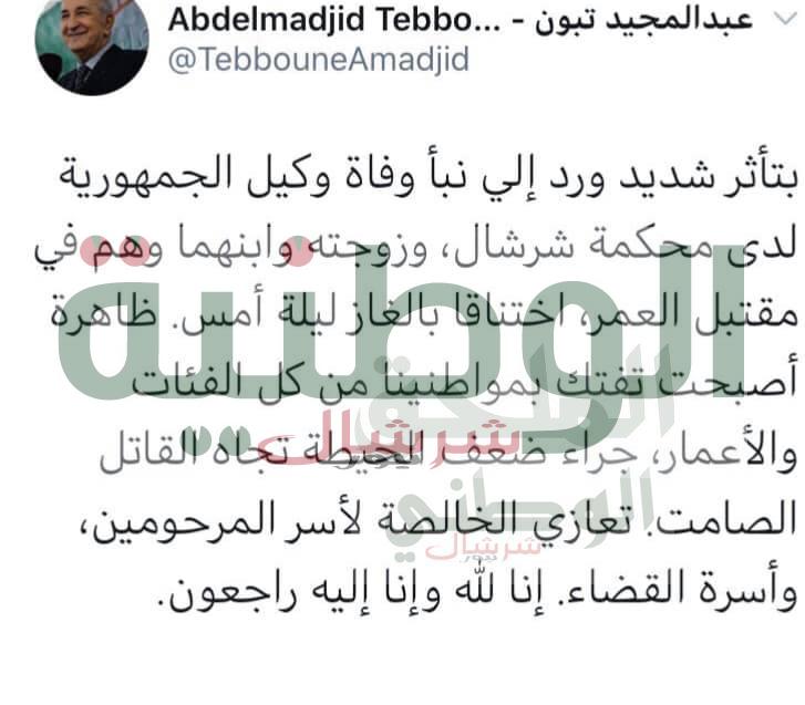 وجاء في تغريدة رئيس الجمهورية، “بتأثر شديد ورد إلي نبأ وفاة وكيل الجمهورية لدى محكمة شرشال، وزوجته وابنهما وهم في مقتبل العمر، اختناقا بالغاز ليلة أمس. ظاهرة أصبحت تفتك بمواطنينا من كل الفئات والأ‘مار، جراء ضعف الحيطة تجاه القاتل الصامت. تعازي الخالصة لأسر المرحومين، وأسرة القضاء. إنا لله وإنا إليه راجعون