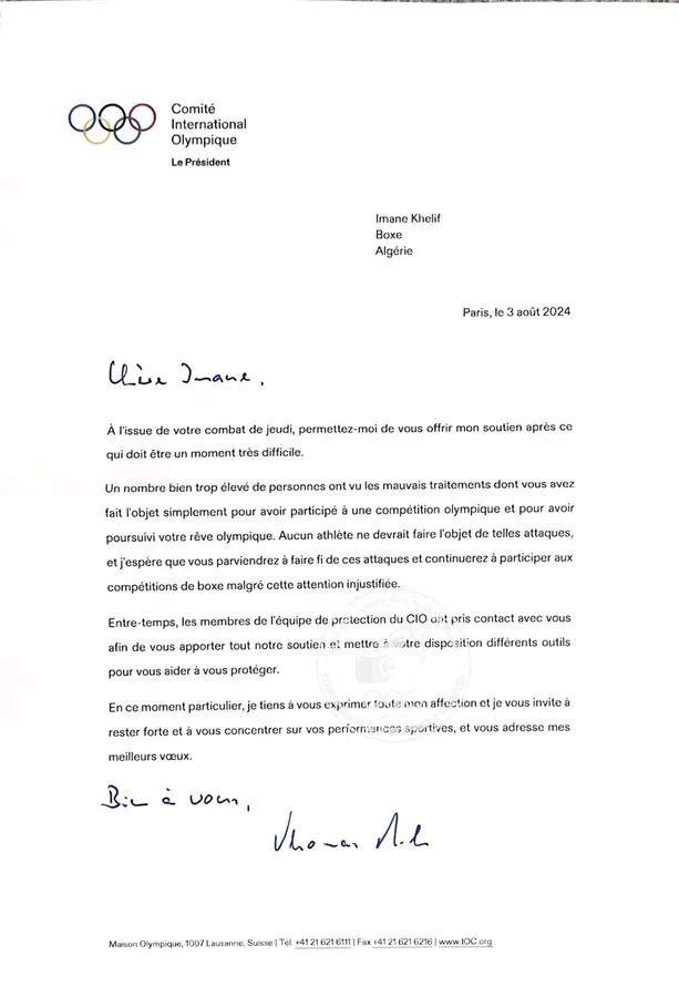وقال توماس باخ في رسالة موقعة وجّهها إلى إيمان خليف مرفوقة بهدية رمزية: “عدد كبير جدًا من الناس قد شهدوا المعاملة السيئة التي تعرضتِ لها لمجرد مشاركتك في مسابقة أولمبية ومتابعتك لحلمك الأولمبي. لا ينبغي لأي رياضي أن يكون هدفًا لمثل هذه الهجمات، وآمل أن تتمكني من التغلب على هذه الهجمات وتستمري في المشاركة في مسابقات الملاكمة رغم هذا الجدال غير المبرر.”
