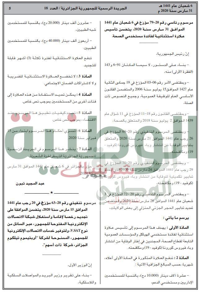 تضمن العدد 18 للجريدة الرسمية، المرسومَ الرئاسي رقم 79-20 المؤرخ في 31 مارس، المحدد و المؤسس لعلاوة استثنائية لفائدة مستخدمي الهياكل والمؤسسات العمومية التابعة لقطاع الصحة، المجندين في اطار الوقاية من انتشار فيروس كورونا المستجد ومكافحته.