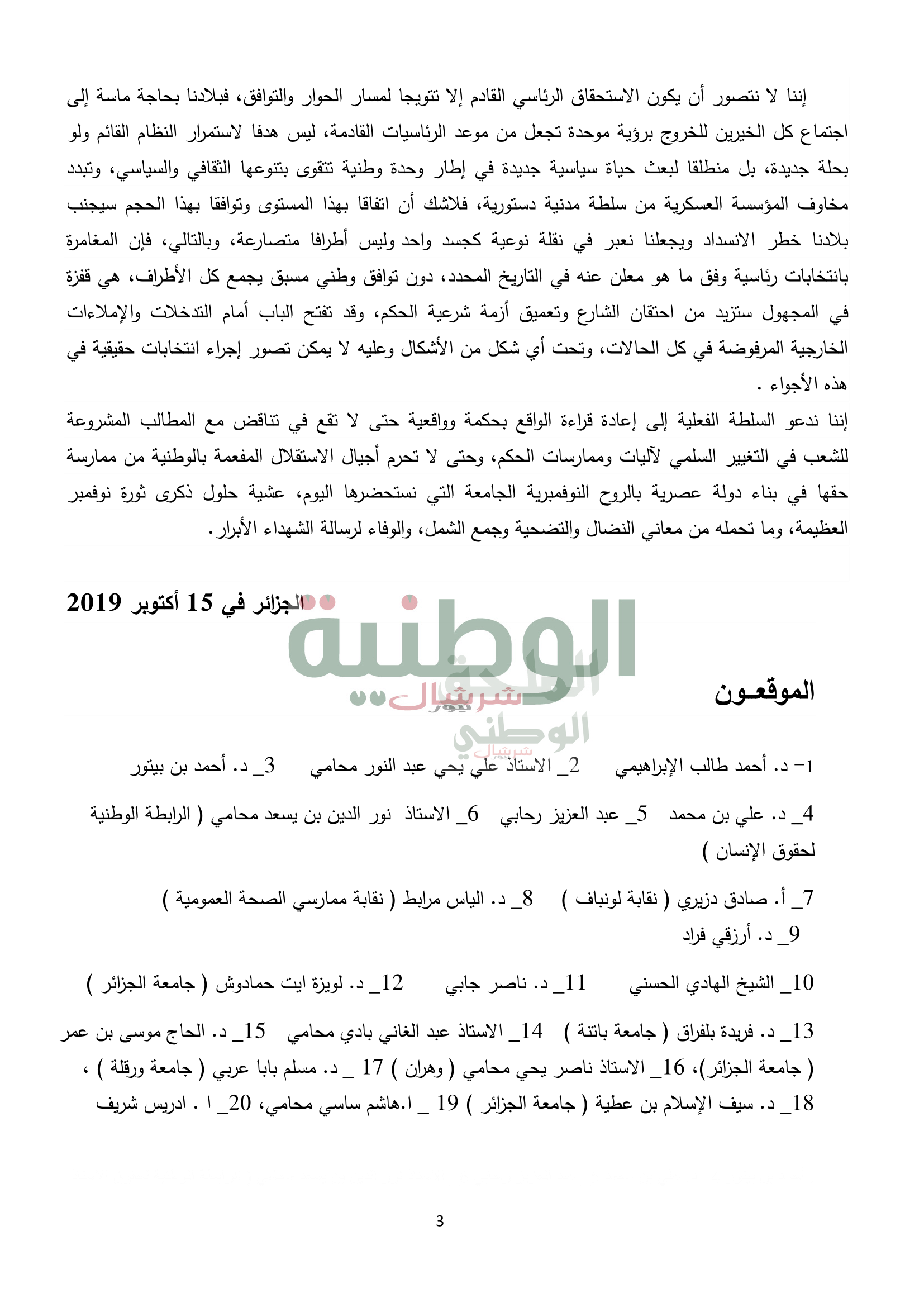 الرئيسية/الأولى/وثيقة/ طالب الإبراهيمي و19 شخصية يوقّعون بيانا حول الوضع السياسي في الجزائر وثيقة/ طالب الإبراهيمي و19 شخصية يوقّعون بيانا حول الوضع السياسي في الجزائر 15 أكتوبر، 2019 15 أكتوبر، 2019 اظهر المزيد