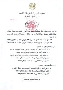 - امتحان شهادة التعليم المتوسط: من 4 ماي إلى غاية 3 جوان 2025.