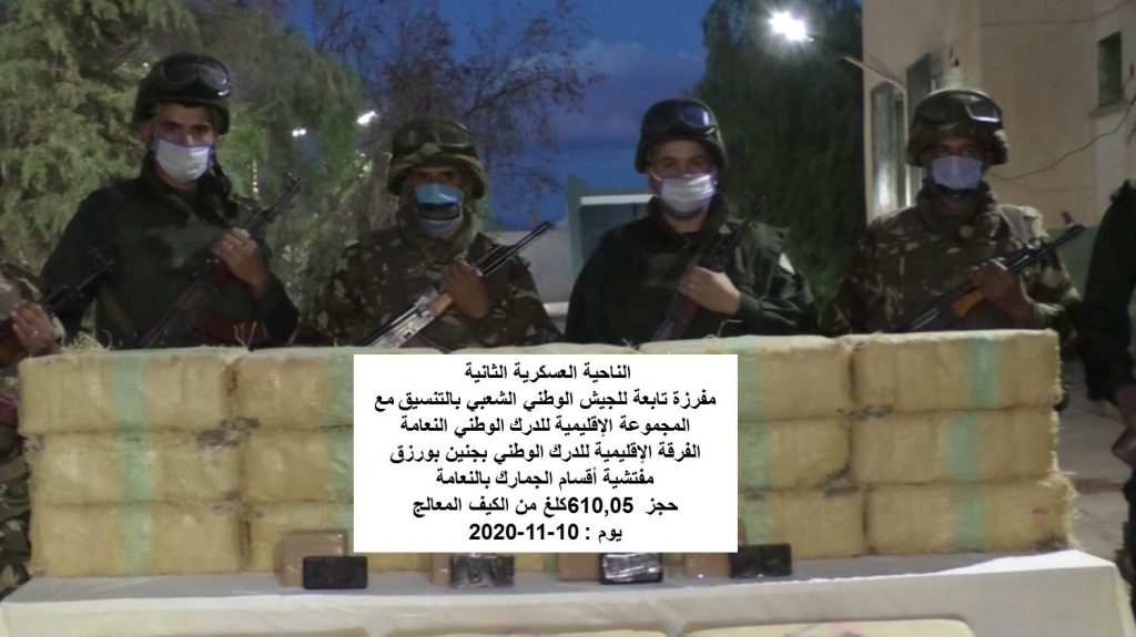 وحسب بيان لوزارة الدفاع الوطني فإن هذه العمليات تمت في الفترة الممتدة من 10 إلى 17 نوفمبر وأسفرت عن توقيف 45 ناجر مخدرات وضبط كميات ضخمة من الكيف المعالج تُقدر بـ 16 قنطار و21.762 كيلوغرام تم إدخالها عبر الحدود مع المغرب.